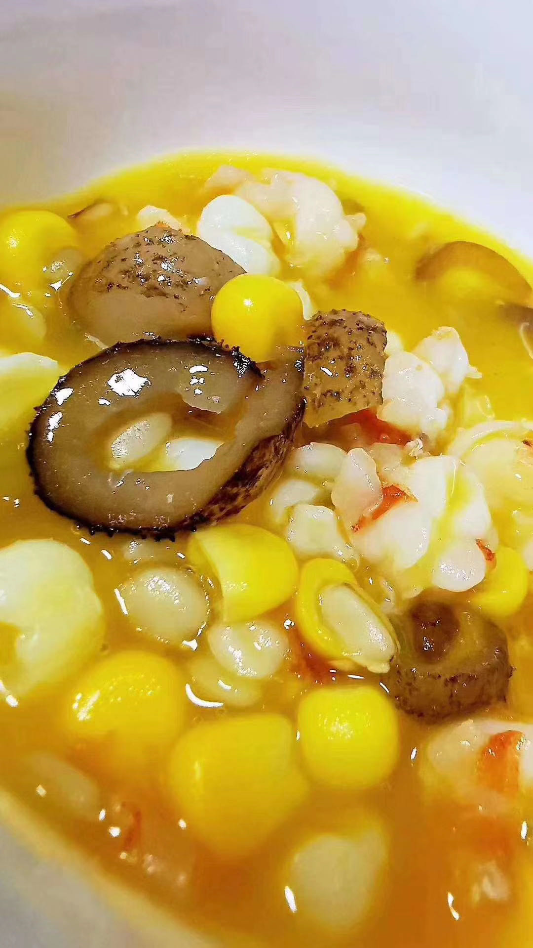 海参Q弹,鲜虾球味鲜美,加上浓稠的南瓜金汤和杂粮满满的粗纤维,简直欲罢不能。